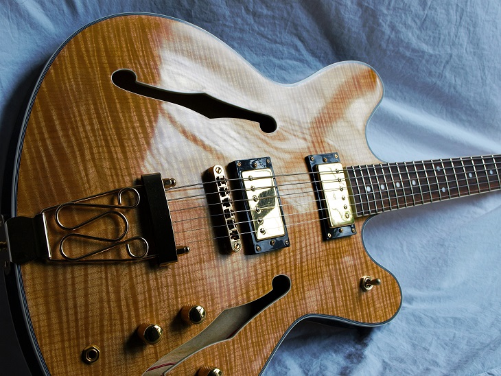 My guitar is hand-finished, all paint was applied by brush, and the overall finish is french polished. There are 73 applications of lacquer on the guitar, which took 6 weeks.