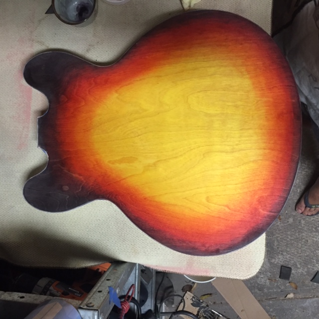 2. Coat 1. Going for a classic look here with a burst using Colortone Yellow, Cherry and black. I had to work fast because Colortone dries real fast. I had to work in sections to try and avoid dry lines at the edges of the colours (worked better in some areas but not so great in others.