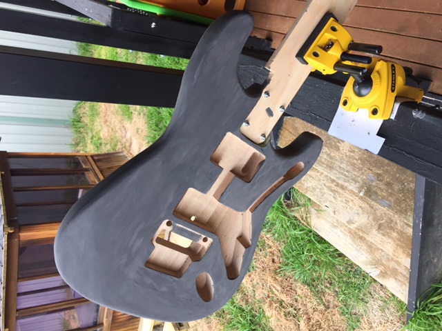 Next I applied grain filler, I went for an ebony colour as i planned to dark stain the guitar with a walnut stain and wanted the grain to really show through ,I let it dry for 24hours then began sanding with 320 grit, I put it on a bit thick so it took a bit of sanding but once I'd finished I was pretty happy, it looked and felt pretty well filled and I decided to risk it and move onto the next step of staining the wood
