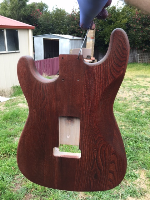 Next step was sanding and raising the grain as its an Ash body so I followed the tried and true method I found online of sand with 240 grit, wipe with wet cloth and repeat until the grain stops lifting, this took about 4 process repeats spread over 4 days until I was happy