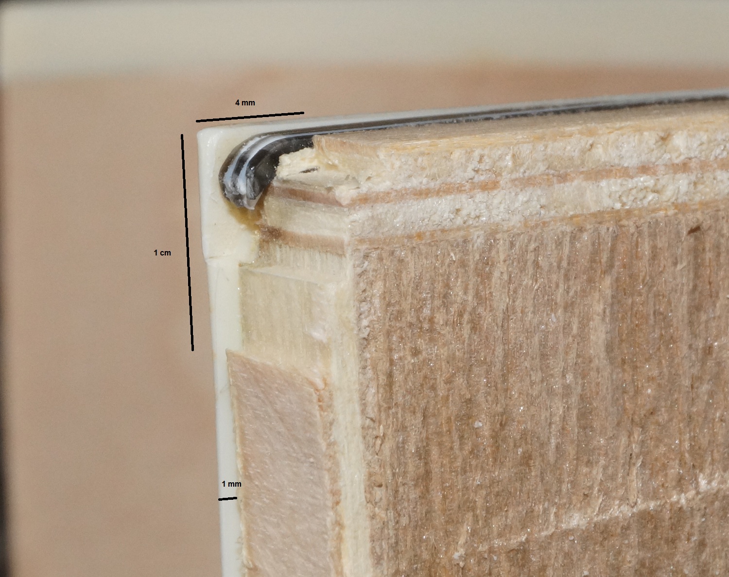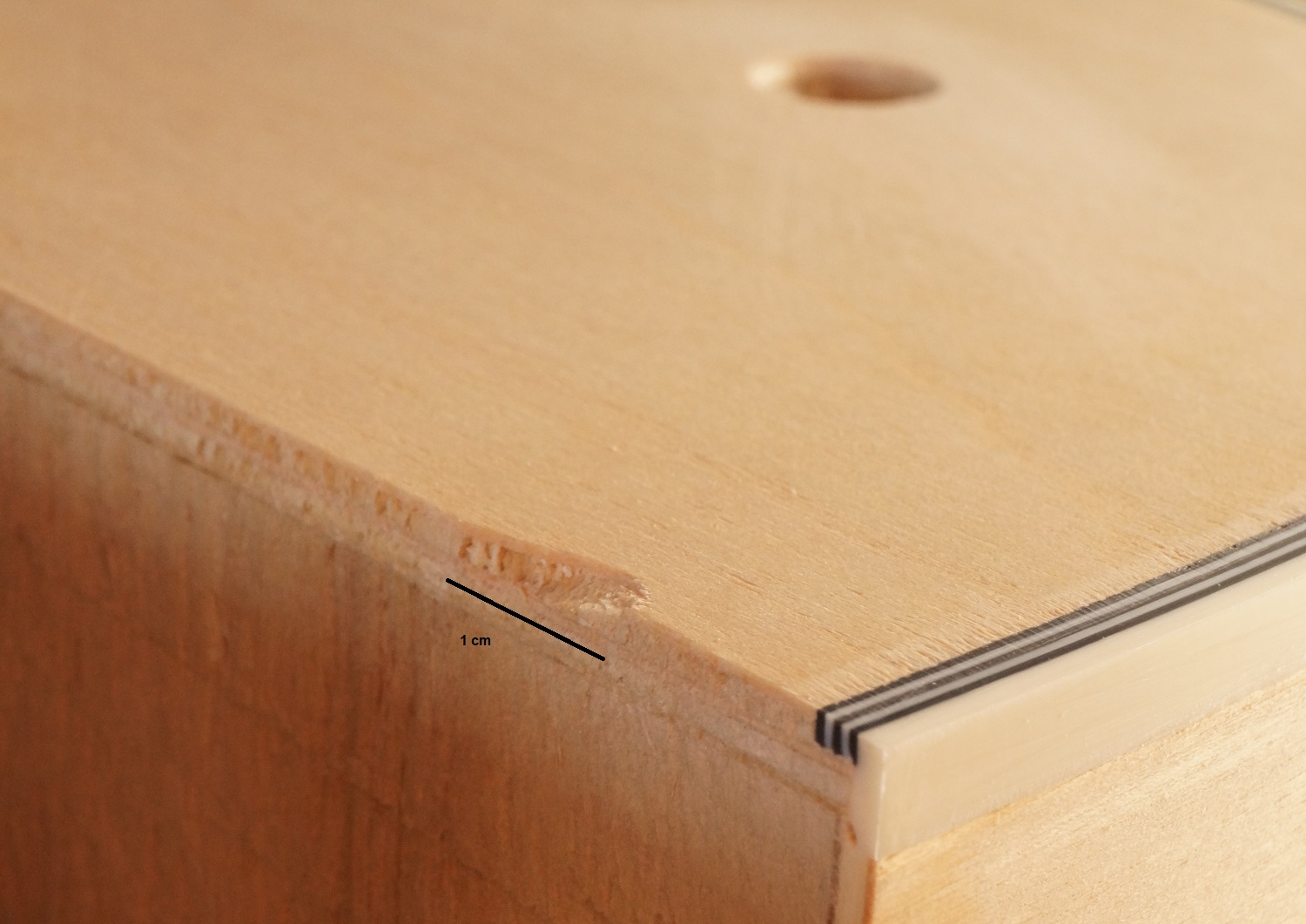 That's the good news. The bad news is I've got a bit more patching to do than I hoped. I knew about the one chip in the veneer on the top of the neck cavity but there's considerably more work to do below the neck cavity. As you can see in the pictures below, there seems to have been a few places where the wood was just a bit too short to match up at the critical point. Not sure just yet how I'll deal with those issues yet but the smaller chip on top I might just use some wood filler - it'd be pretty hard to get a tiny piece of veneer in there.