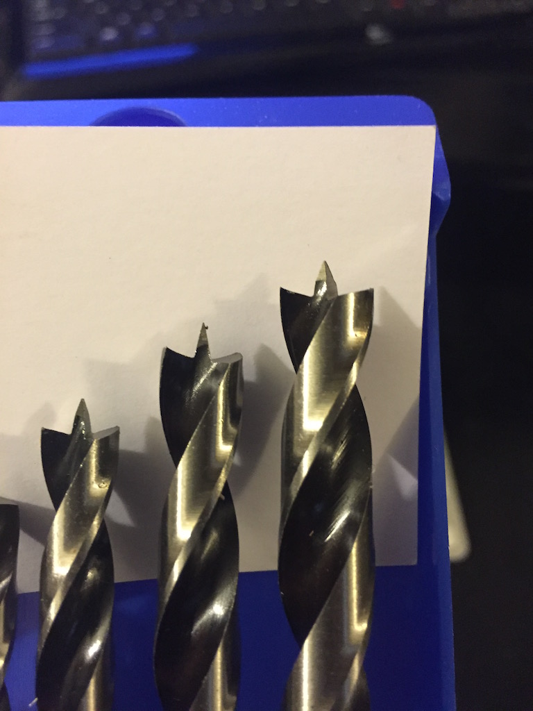 I was pretty sure that I saw in a video or read somewhere that a 7/16" bit was required. While at the hardware store, I brought the bridge along and tried to measure by holding the bit up to the pieces. Thought I might be OK with a 3/8" bit, so I went with that. And also because they didn't seem to have any bradpoints at 7/16". MISTAKE!