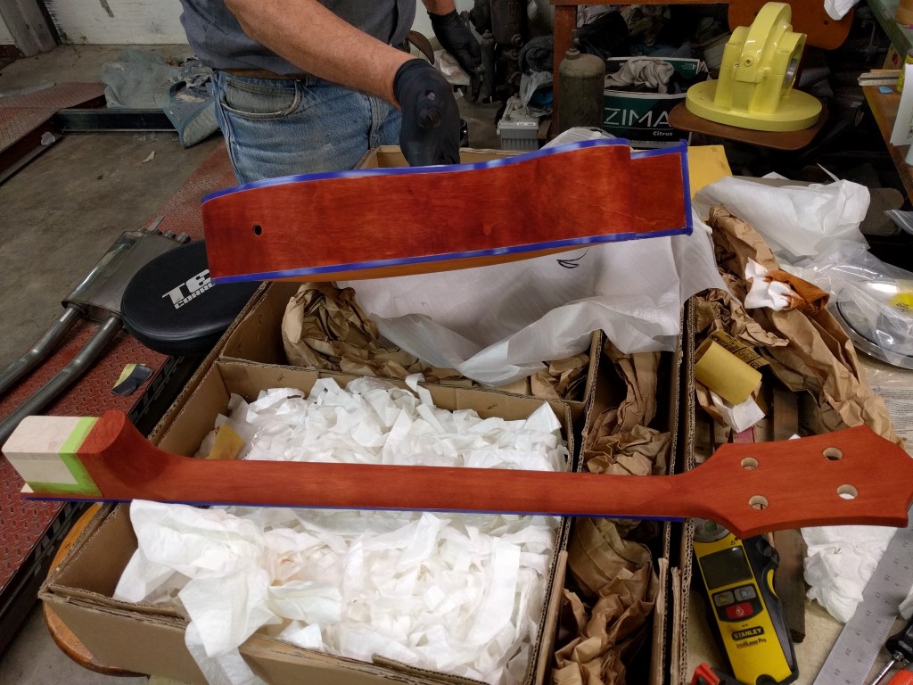 The neck was actually a tiny bit too big to fit in the pocket correctly, so some careful judicious sanding was needed. Also, there was a bit of...slag? in the pocket (wood bits in the corners that hadn't been routed out correctly), so a bit of time with a file was needed to clean that up. Once we were sure the neck was seating in place properly, we threw some clamps on it.