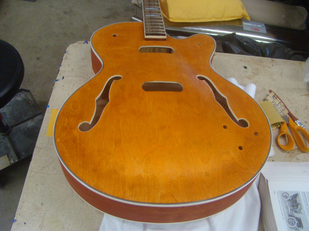 After oohing and aahing at the contents of the box, and confirming that we had all of the parts, my father did the sanding on the neck and body. Perhaps we should have checked neck alignment first, but I wasn't going to be around for a while and we were eager to get work started on the project. Luckily, no ill came of it.