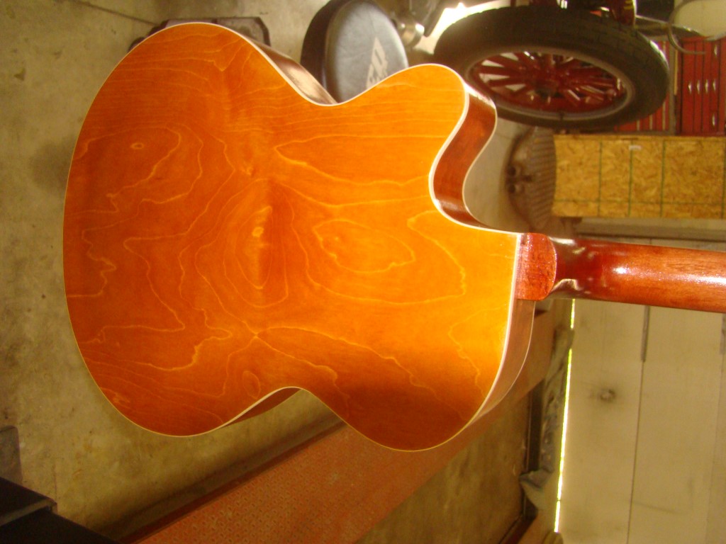 Next we stained the body and neck, deciding that we'd do the staining while the guitar was still in two pieces, and then glue in the neck so the guitar could be finished as a single unit. We used Solar Lux dyes (because our friend had some on hand, and we'd read that they were good for this sort of thing), applying medium brown mahogany to the neck and the sides of the body, and golden fruitwood to the front and back. (We did the back, then let it dry thoroughly. Then did the neck and sides, letting them dry. Then we did the front.) The dyes looked great while they were wet, but ended up very "flat" looking when they dried.