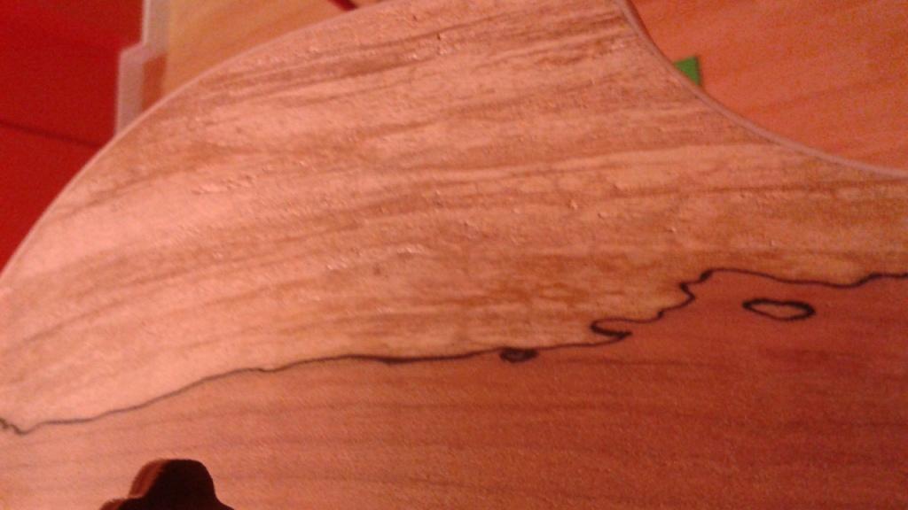 About sanding, I am afraid that the laminated spalted mapple top is very thin, as Gavin1393 put it in his 17-05-2013 (2:04 am) entry in the "How to build your Pit Bull guitar" forum. Therefore, I am afraid to sand it too much, even if I' doing it manually. Some spots of the underneath layer are actually showing...