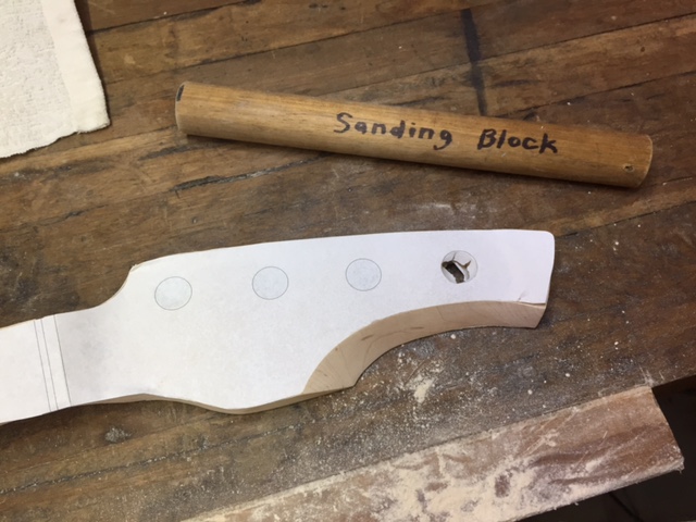 To use the template, print out both the top and bottom templates. I glued the templates to the headstock temporarily with some spray glue. This stuff allows you to remove the paper easily later on. Use the tuner holes to align the plans on the headstock.