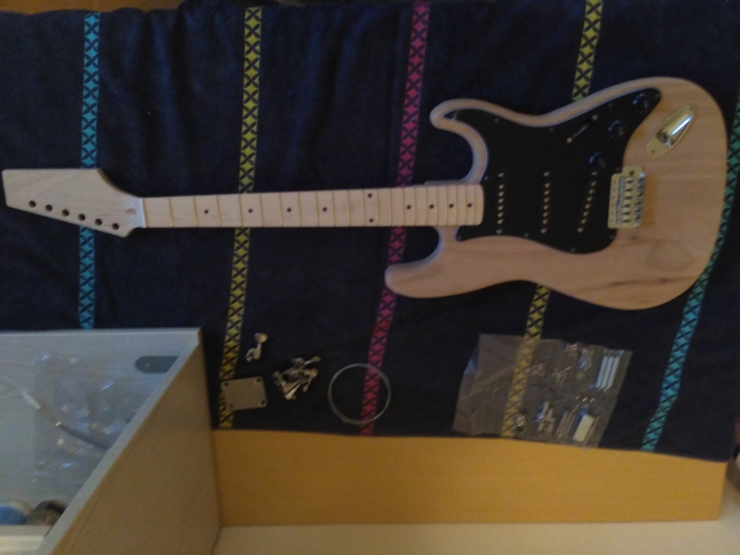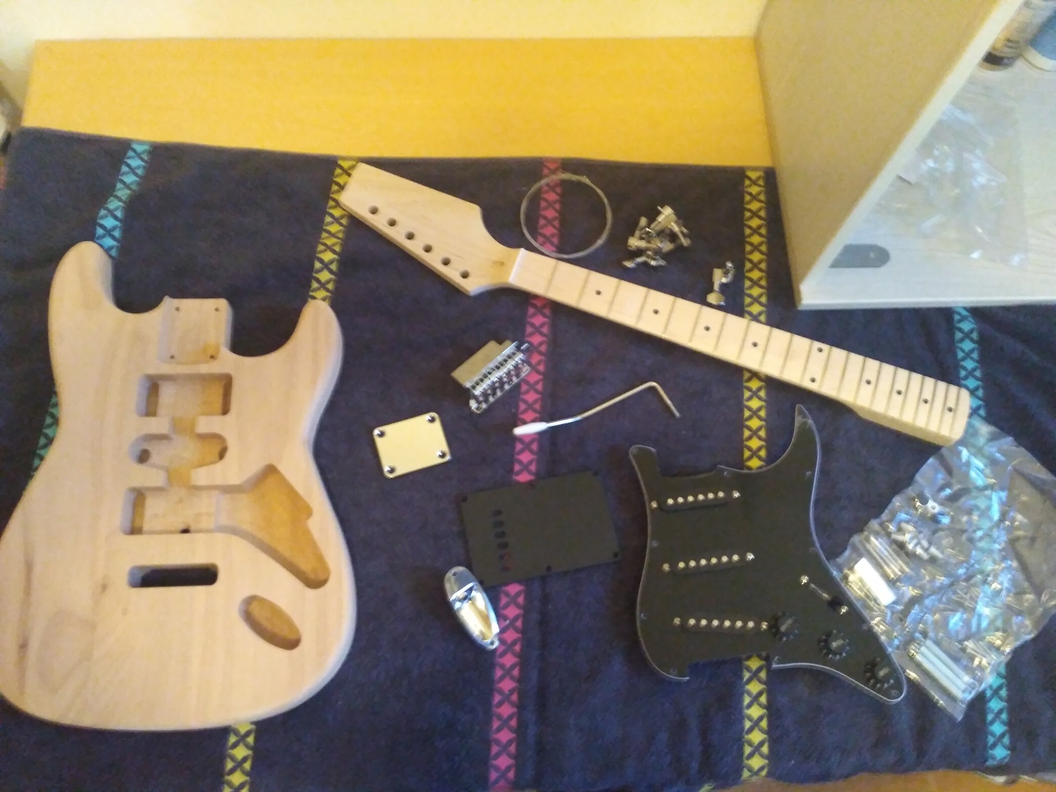 The project is a black strat like Gilmours so the kit came with an alder body and black pickguard and mapple neck and fretboard.