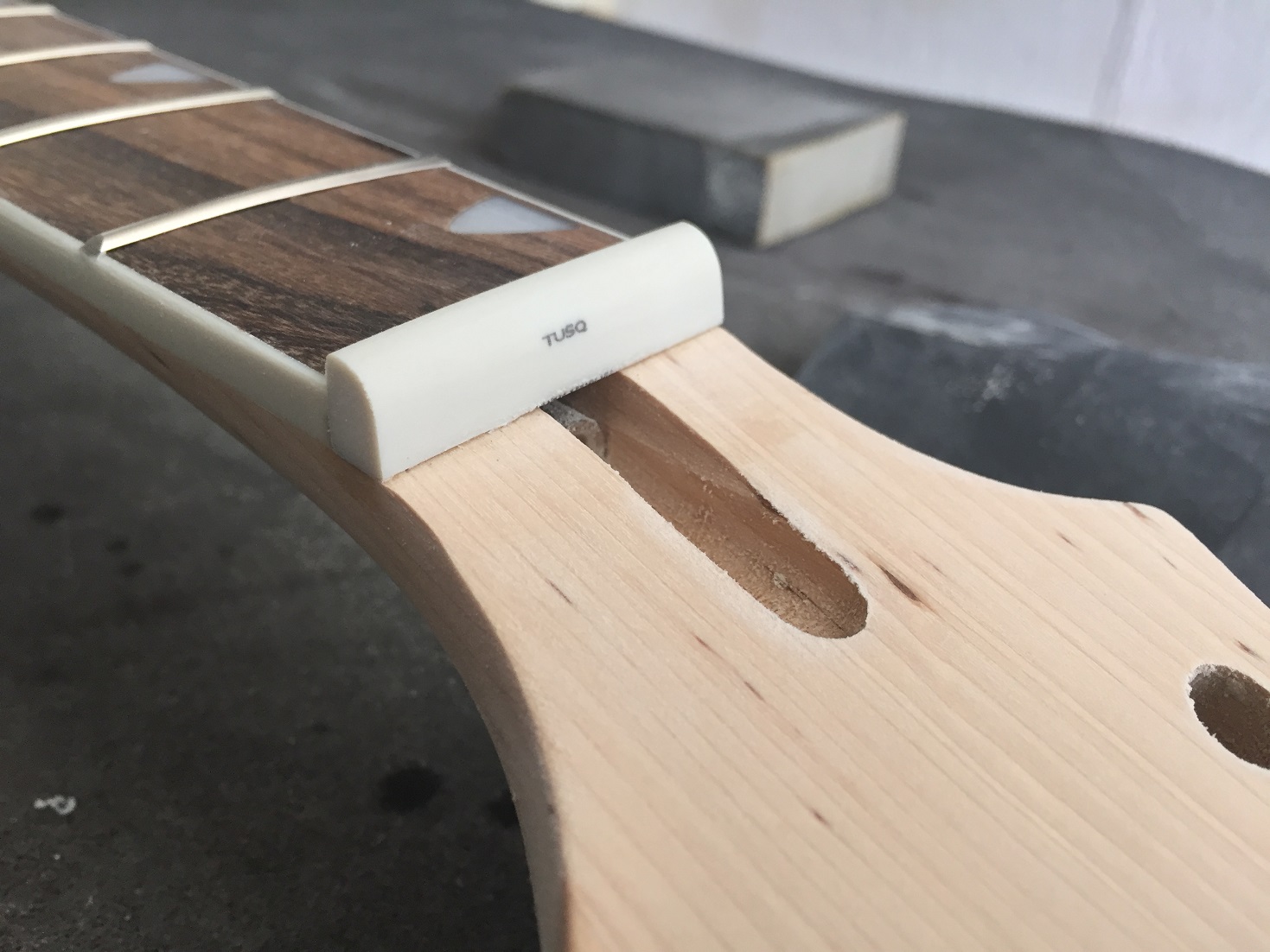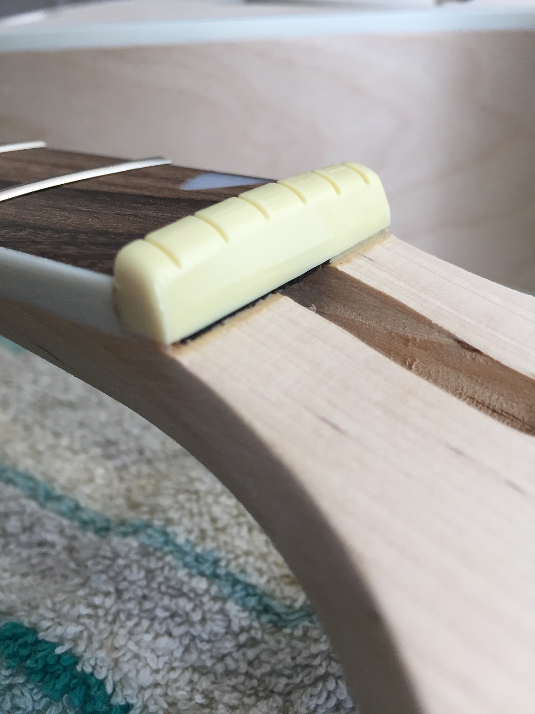 So I removed the plastic nut, cleaned the neck up, shaped the nut and glued it in place.