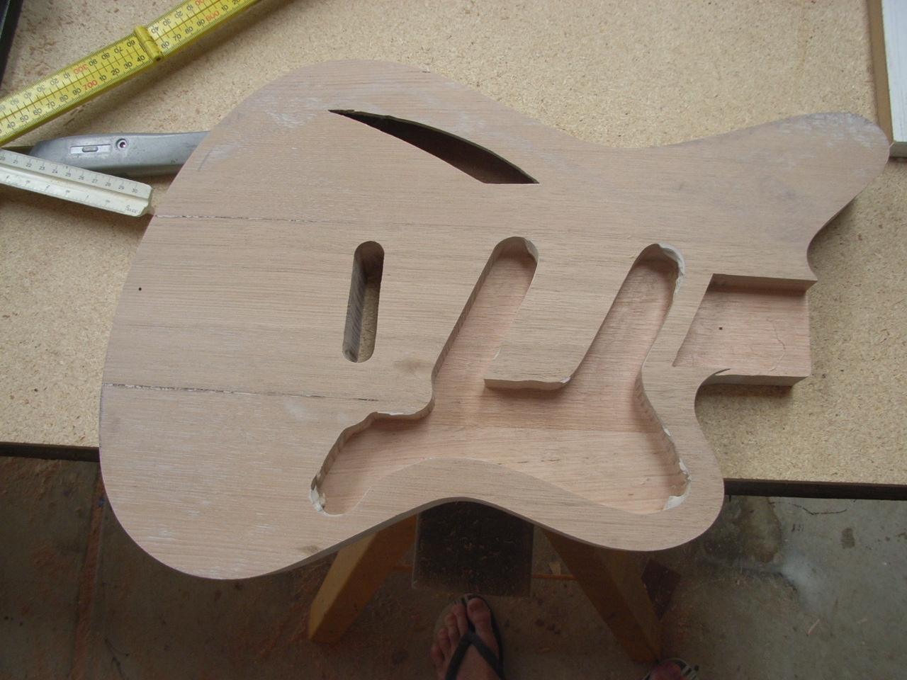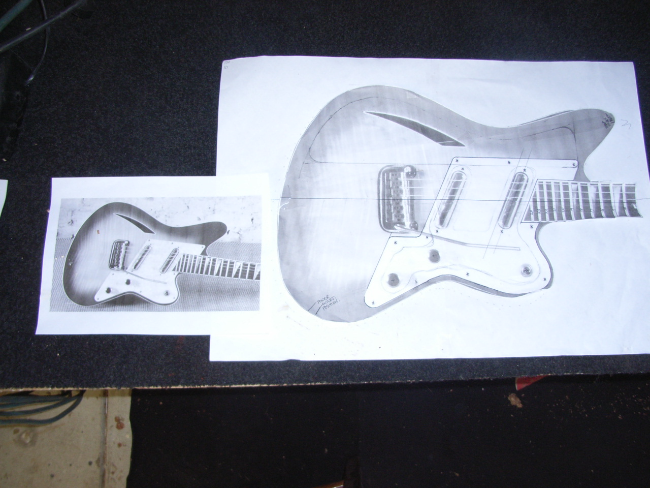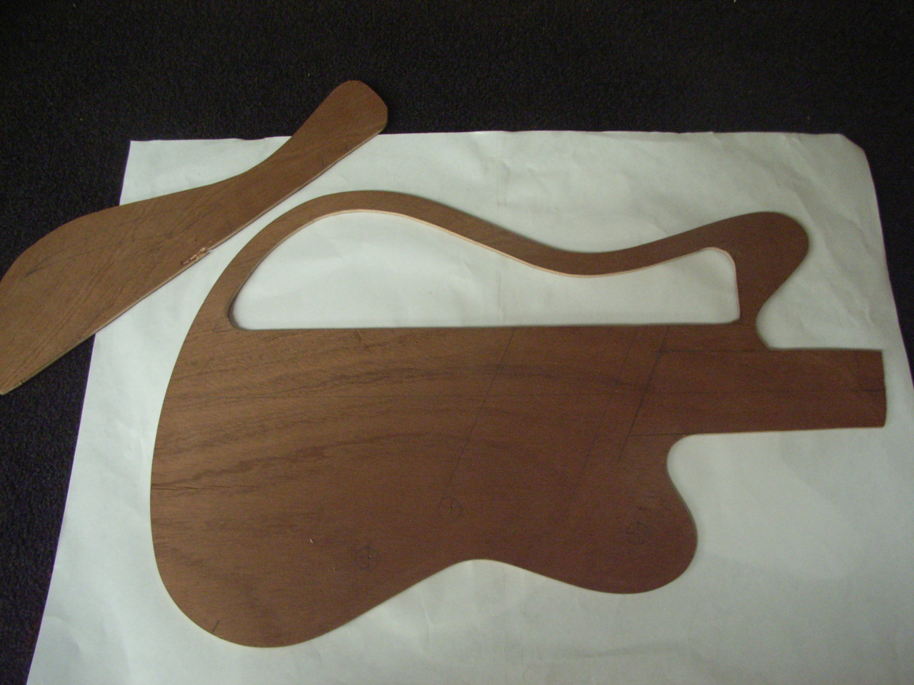 Well the planning started a while back after seeing a Charvel Surfcaster posted on possible kit ideas, so I figured I'd have a crack at a scratchy. First I sourced a photo so I could come up with a shape. Then I enlarged it to what I figured was the correct size, which took a while, and created a template out of some ply I had lying around.