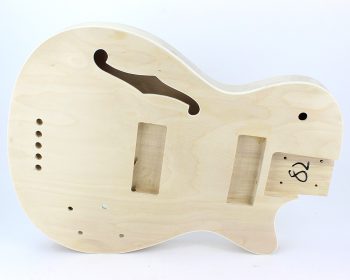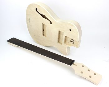 Semi hollow body. Bolt on neck. Control cavity on back....less fishing electrics through the F hole required. The bridge is not a three point style used on other kits...that allegedly have a propensity to pull out from the body of the Bass guitar.