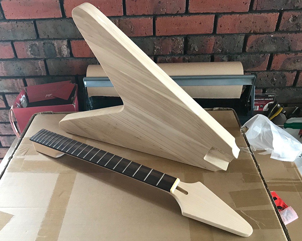 The neck is maple with an Ebony fretboard, no inlays, and a blank, un-drilled headstock. It has side dots.