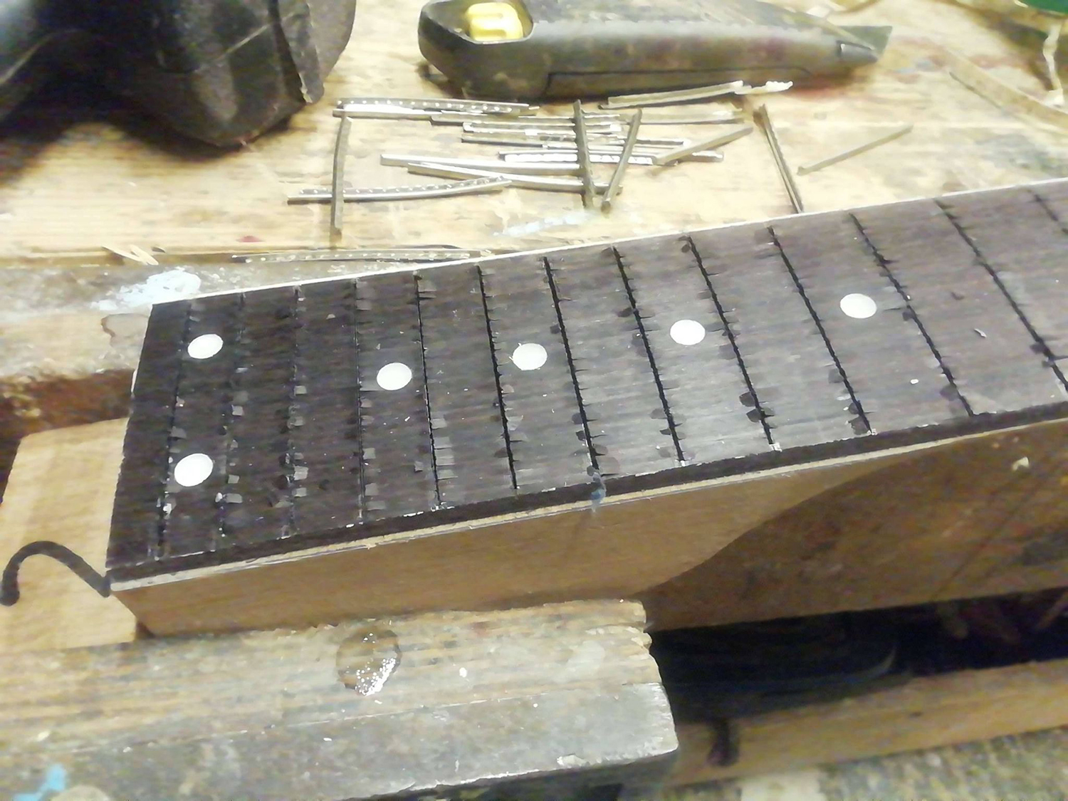 It's meant to be a donor for the truss rod so Jim can make his own neck. The neck was quite twisted. The engineered 'rosewood' fretboard is just being used to mark off the spacing for a new fretboard. Jim pulled out the frets on the engineered board and it's not pretty. OK, he was quite rough with it and this isn't the best quality picture, but you can see that even with a bit more care, re-fretting an engineered board probably isn't going to work.