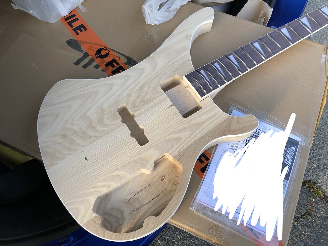The first thing I've noticed is that I got some really bad luck with the grain on my guitars I buy sight-unseen. Oh well. I was going to do a transparent red oil finish, but maybe a sunburst of some kind is in order, instead. All else fails, I can paint it... no idea how I'll do that, so fingers crossed that the stain works...