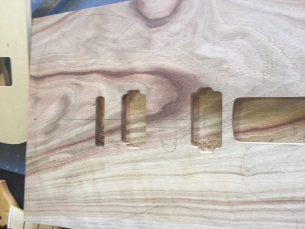 Routed out the pickup and and neck routes before cutting the shape on the bandsaw. Then refitted templates and pattern routed the edges to clean it up a bit.