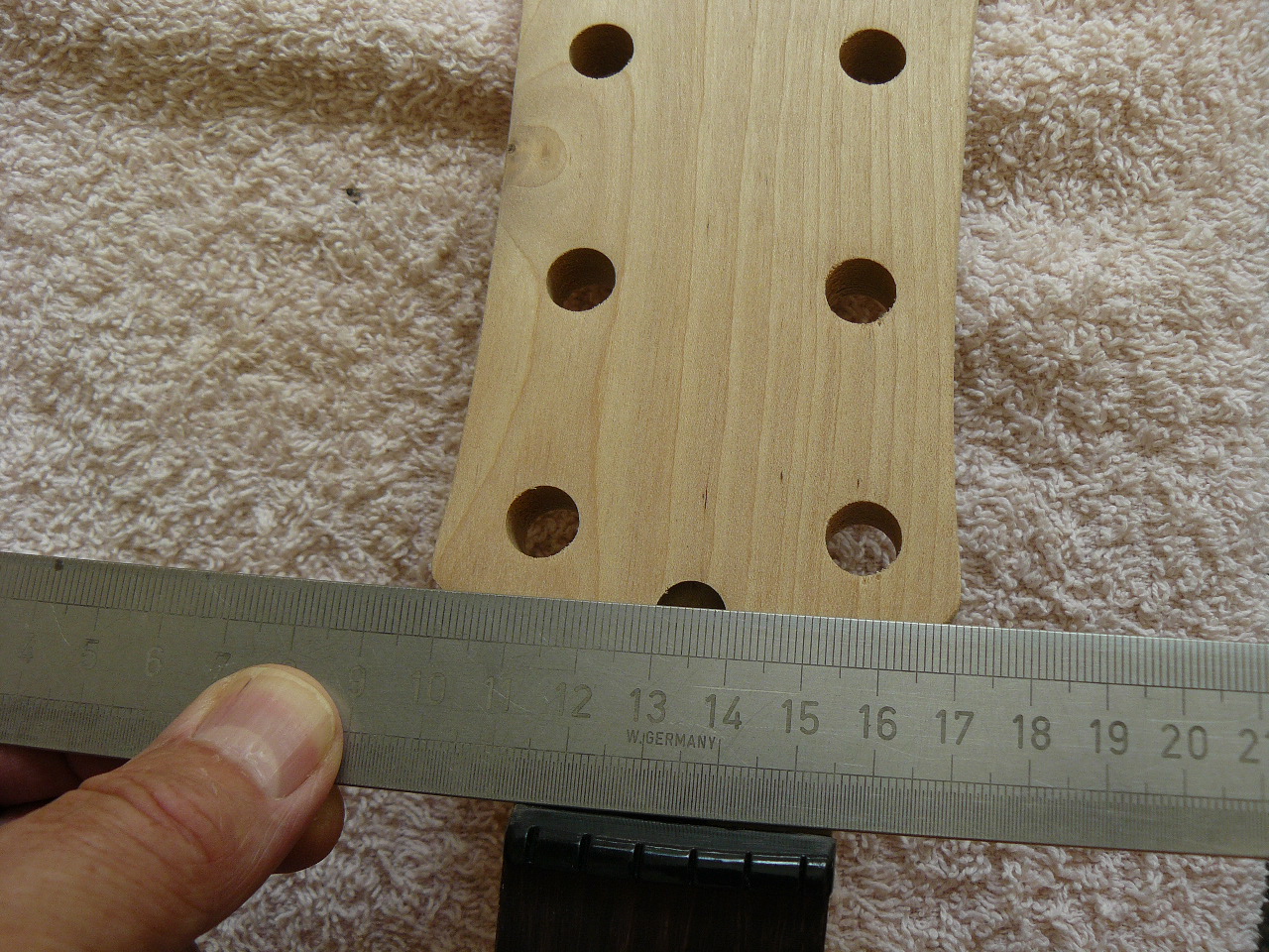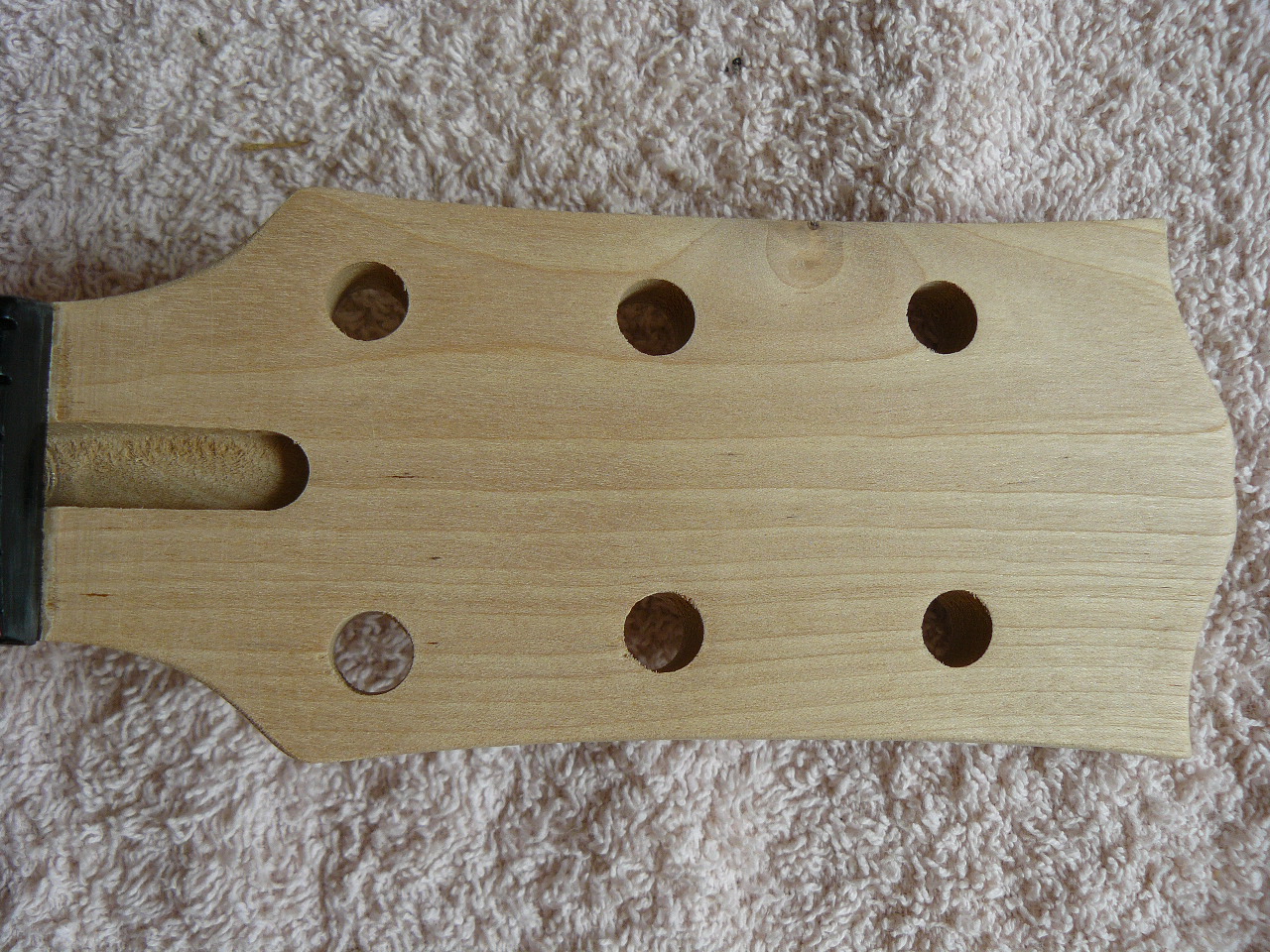 the holes are simply erratic. I suppose it would be possible to bush with maple plugs and re-drill (adding a veneer to the headstock if the inserts appear beyond the machinehead washers) but I think I'll leave it be. It does give a "handmade" look to the instrument (and I'd probably only mess up the fresh holes!). Incidentally, there are a number of knots on the neck, something that never bothers me unless they are really unslightly and an actual weakness. I once held a Strad' - it was made during his "golden period" and was a true work of art, yet strangely the timber chosen was not the finest tonewoods and there were several small, and unattractive, knots on the back. The sound was superb, though.