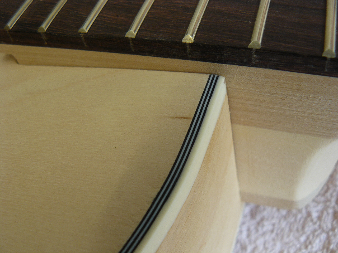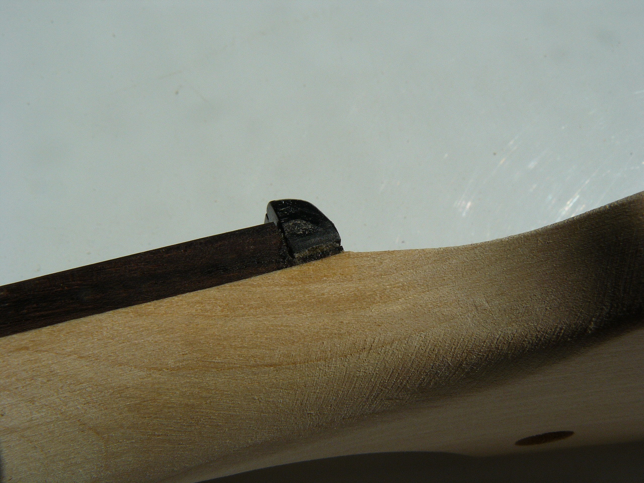 Previous post shows the top nut. My next job is to remove this and cut a decent base for the bone piece that will replace it after finishing. I think finsihing will take longer than usual - I'l be trying to put off the time when I have to fit the electrics - something I have never done before...