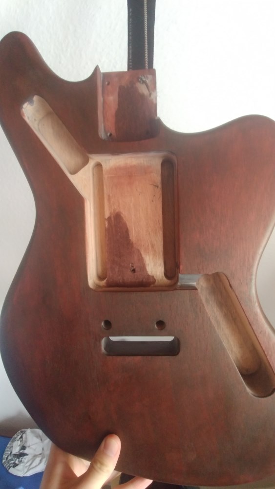 The idea was to pop the grain by using black wood filler and sanding it back but the effect is not as strong as I thought. Nonetheless I went on and stained the guitar with a water based mahogany stain that I bought a few month ago. It turned out a little more red and dark than I intended so I had a little fun mixing my stains and added red and a little black.