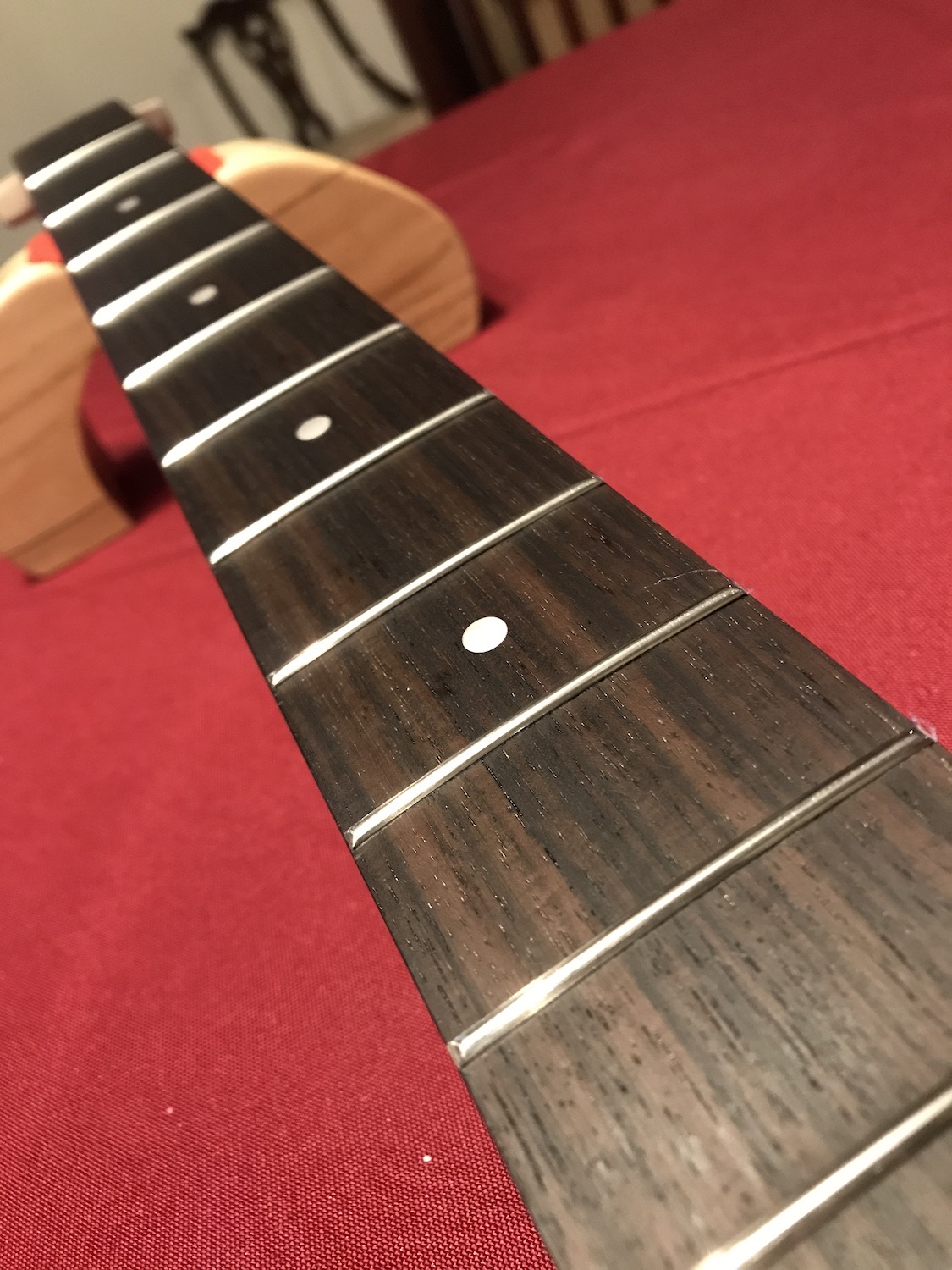 Started work on the neck today. It had a pretty big back bow so a bit of truss rod adjustment needed to get it flat. Then I levelled the frets, and crowned and polished them. Then cleaned everything up and finished with a little fretboard oil to make it all look nice. Very pleased with the results.