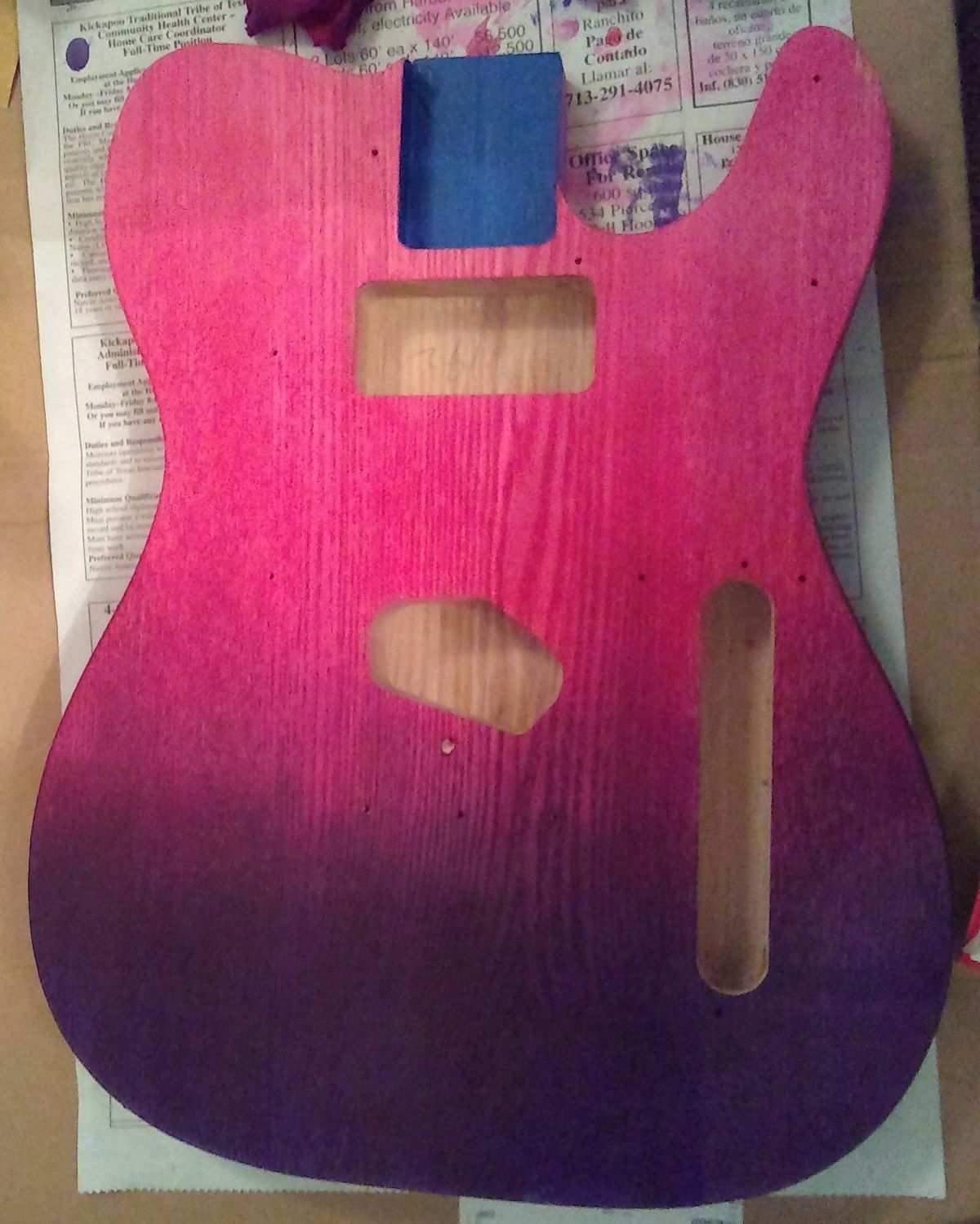 I however, have a different question. I started to dye my guitar using leather aniline dyes. I left it for about 16 hours, and began applying tru oil to the back of the guitar. I found, however, that some of the dye rubbed onto the rag. How long must one wait to apply tru oil after dying a guitar? Here are pictures of the front and back