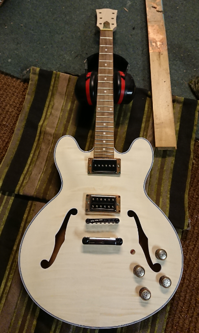 F hole bindings needed a bit of fine filing, binding at the neck joint had been cut long and needed filing back flush but this is minor cosmetic work. Neck pickup pocket slightly too small but this has been covered in posts by others and was quick and easy to sort out. POT holes were drilled at 8mm so had to open these up to 10mm to allow the CTS ones to fit. Another simple enough job.