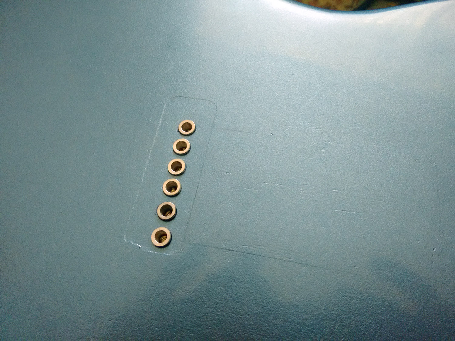 The re-filled tremolo rout and the filled in Jazzmaster style tremolo rout.