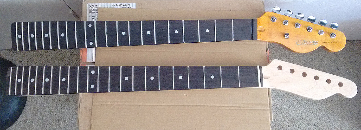 Those Kmise necks are pretty good for the price. I used a pre finished 22 fret one on my Denim Tele build and it turned out fine.