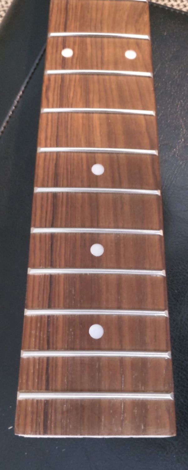 Remember how on this cheap Kmise neck the fingerboard is higher on the treble side than the bass side? A little careful sanding, and the "plug" now compensates for the difference in the sides of the fingerboard. I am not sure I could have done this on purpose, but voila! I knew I would need to compensate for the fingerboard, but figured I'd do it with by adjusting the bridge up a bit on one side. I was not sure whether this is something that you'd be able to see, but the lateral problem is now taken care of. The only other problem related to this that I see at the moment is that the nut slot is, effectively, deeper on the treble side than the bass side. I have been cutting a nut to compensate out of bone... More on that once it's ready...