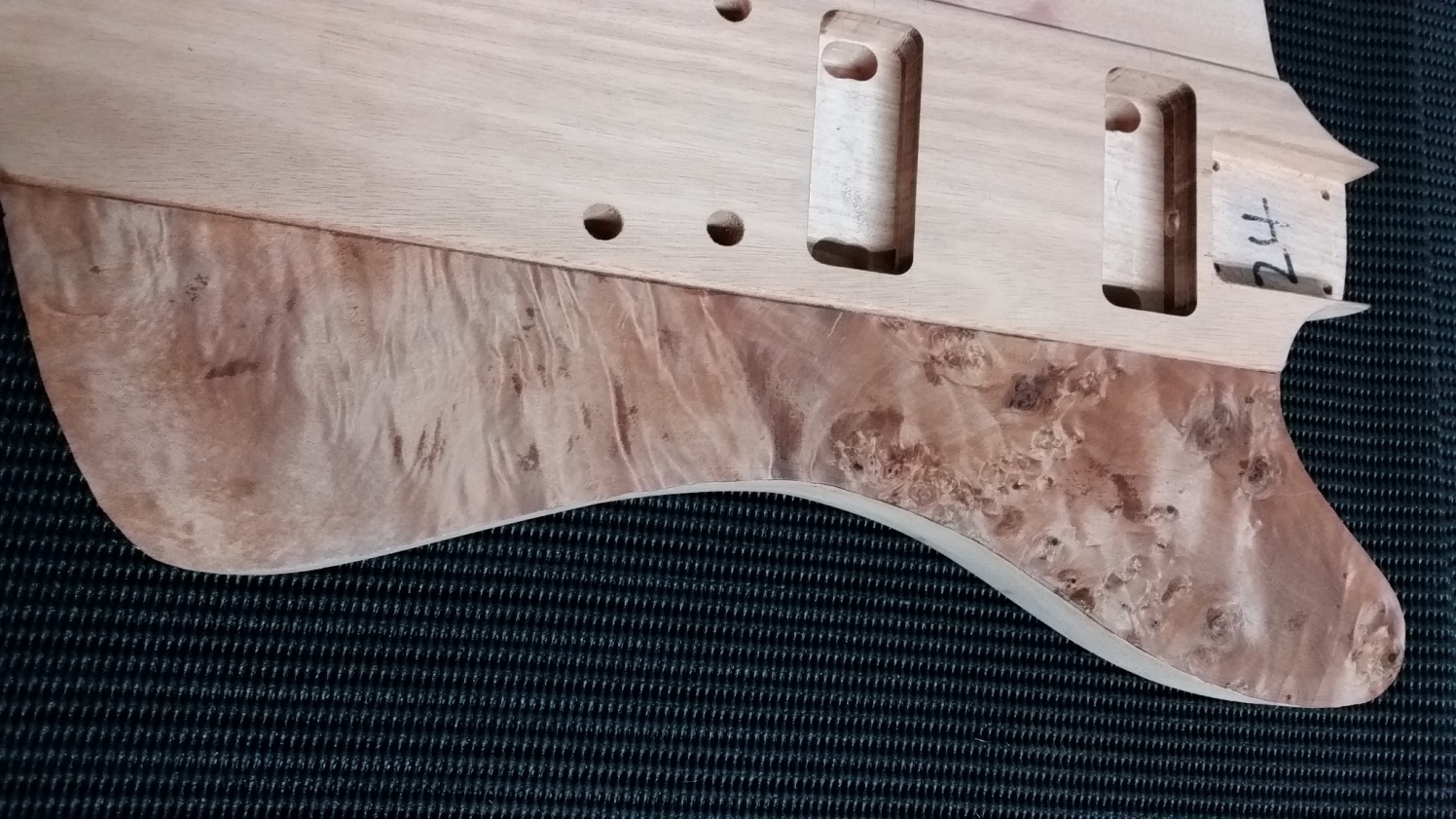 More adventures in applying veneer. Got hold of some hide glue and had a go at the control side of the body. Trimmed the straight edge back to straight and taped into position. Applied the hide glue, lay the veneer in place, slid into the vac bag and used the vac bag to pull the veneer flat. Then a sheet of melamine on top, old socket set and bbq gas bottle for weight and left it for an hour and a half.