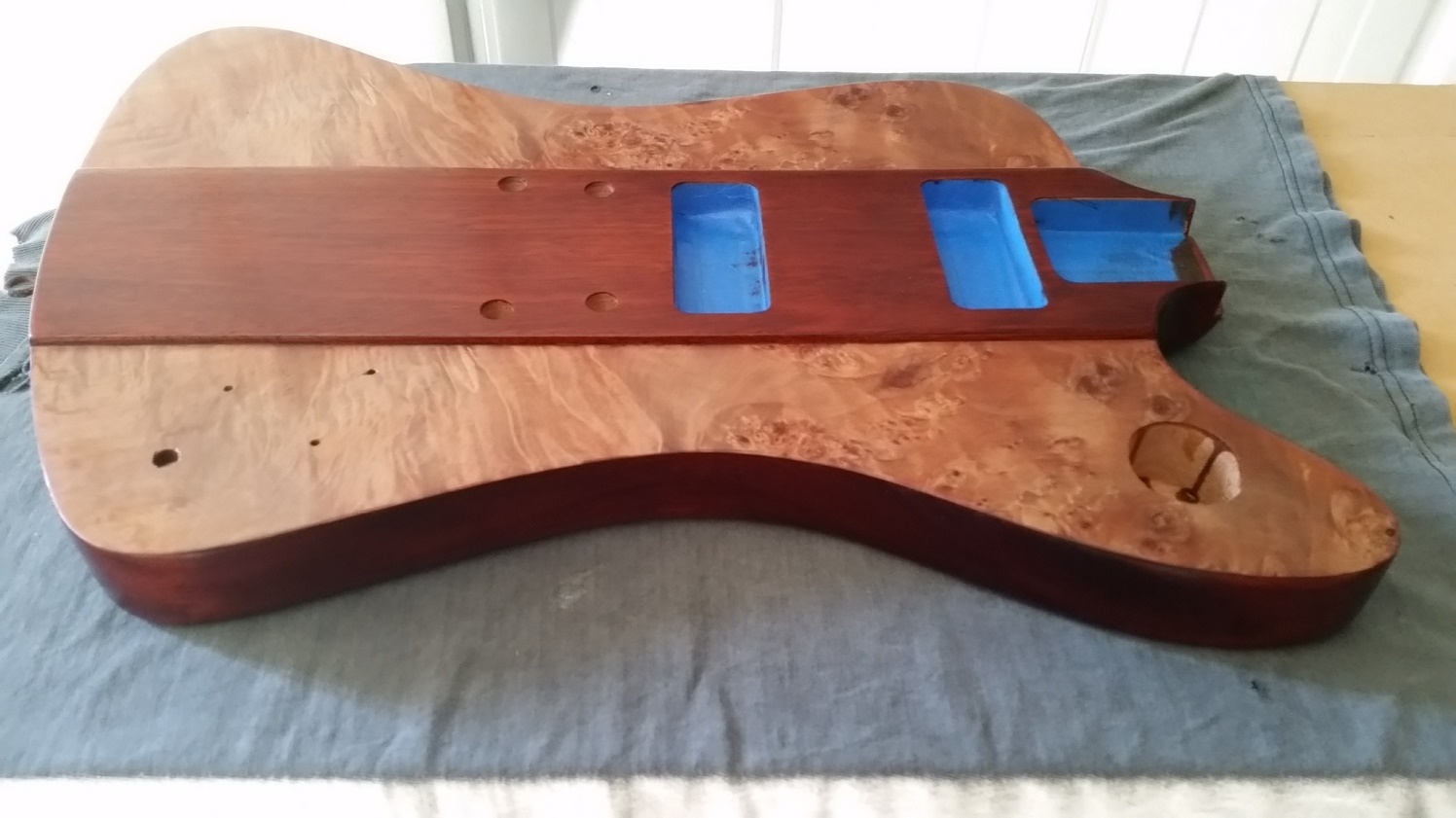 The body has been grain filled with Jarrah timbermate and sanded with 320 grit. Mixed up a colour with colortone stains and applied that to the body. Ended up darker than intended but it's on there now. The colour itself is quite good - vintage amber, cherry red and medium brown - but not sure if it's too dark for the veneers. Pics are with one coat of poly on all.