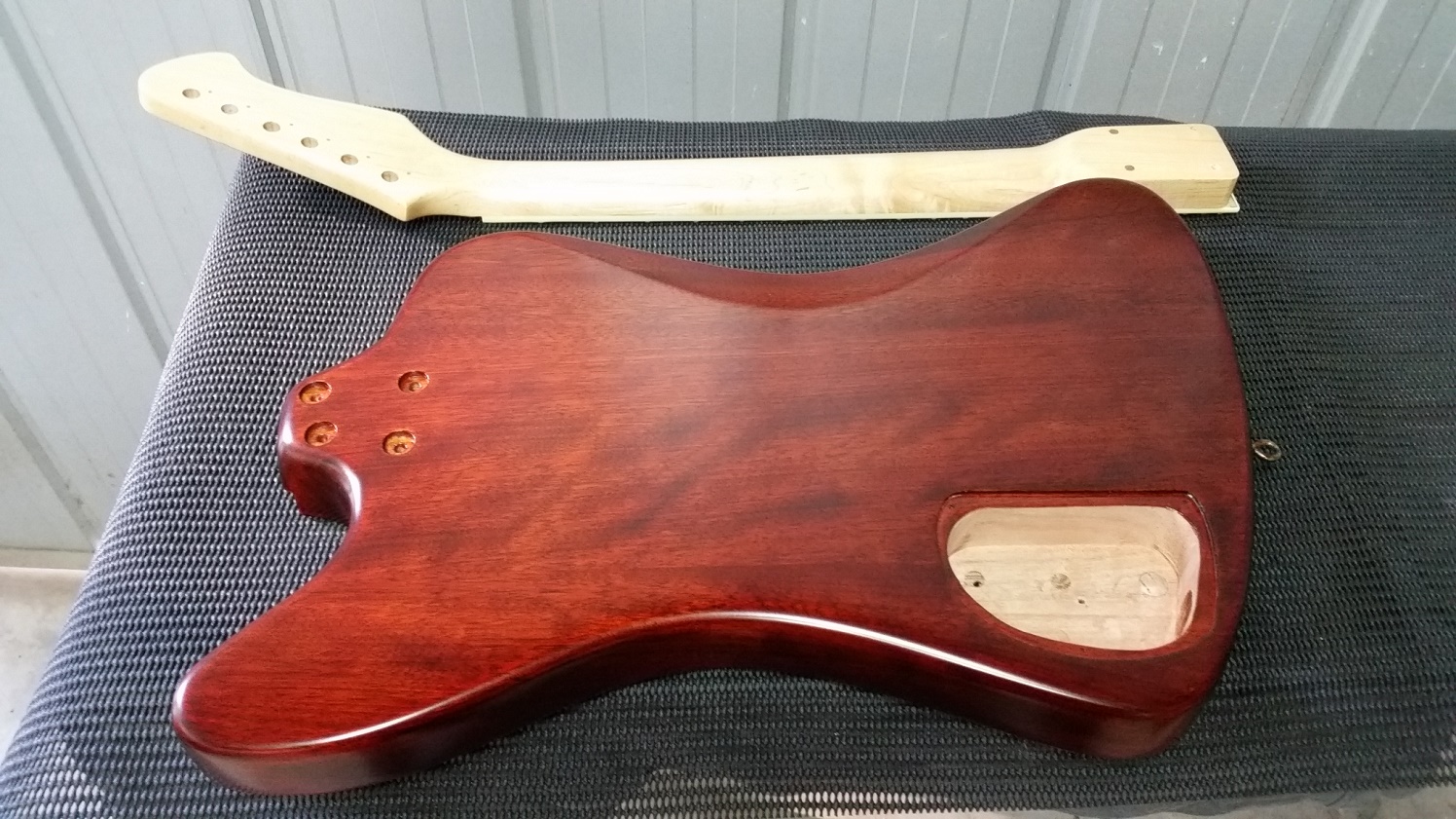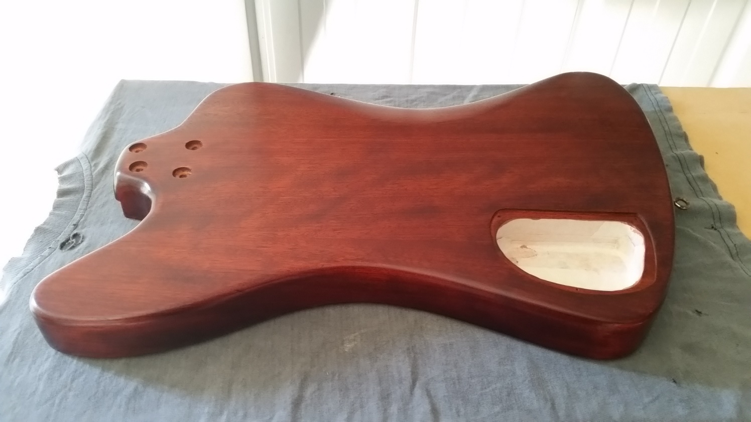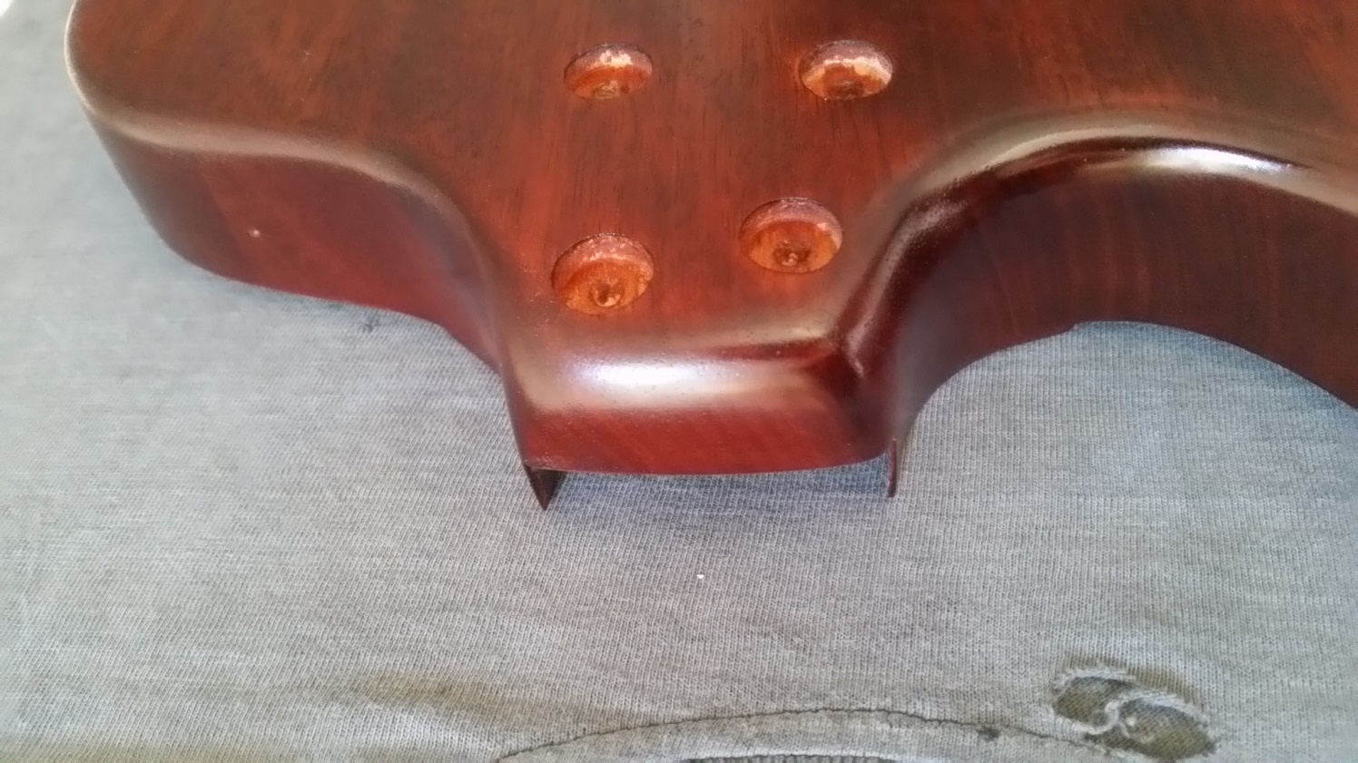 Good thing about it being dark is that it makes the area on the side I sanded through and the neck hole plugs hard to notice.
