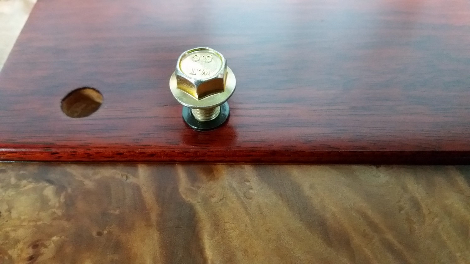 Went to install the bushes for bridge and tailpiece and they dropped in the holes with no effort at all, not good. I bought Gotoh pieces and only checked they fit by using pvc tubing in place of the bushes, but didn't think to try the actual bushes in the drilled holes. With all the finish coats on it was a bit late to plug up and redrill holes but managed to dodge a bullet by using unused bushes from previous builds. Sanded the chrome and painted the shoulder with some charcoal left over from the esp build. New hardware is cosmo black and the charcoal doesn't quite match but is close. Threaded a M8 bolt into the bushes when knocking them in to avoid chipping the paint off.