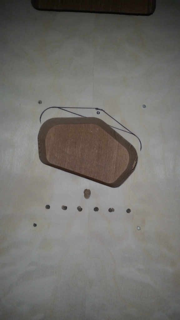 Finally a minor update, after doing a bit of sanding and drilling the string through & ferrules finally marked out what has to be removed for the bridge pickup.