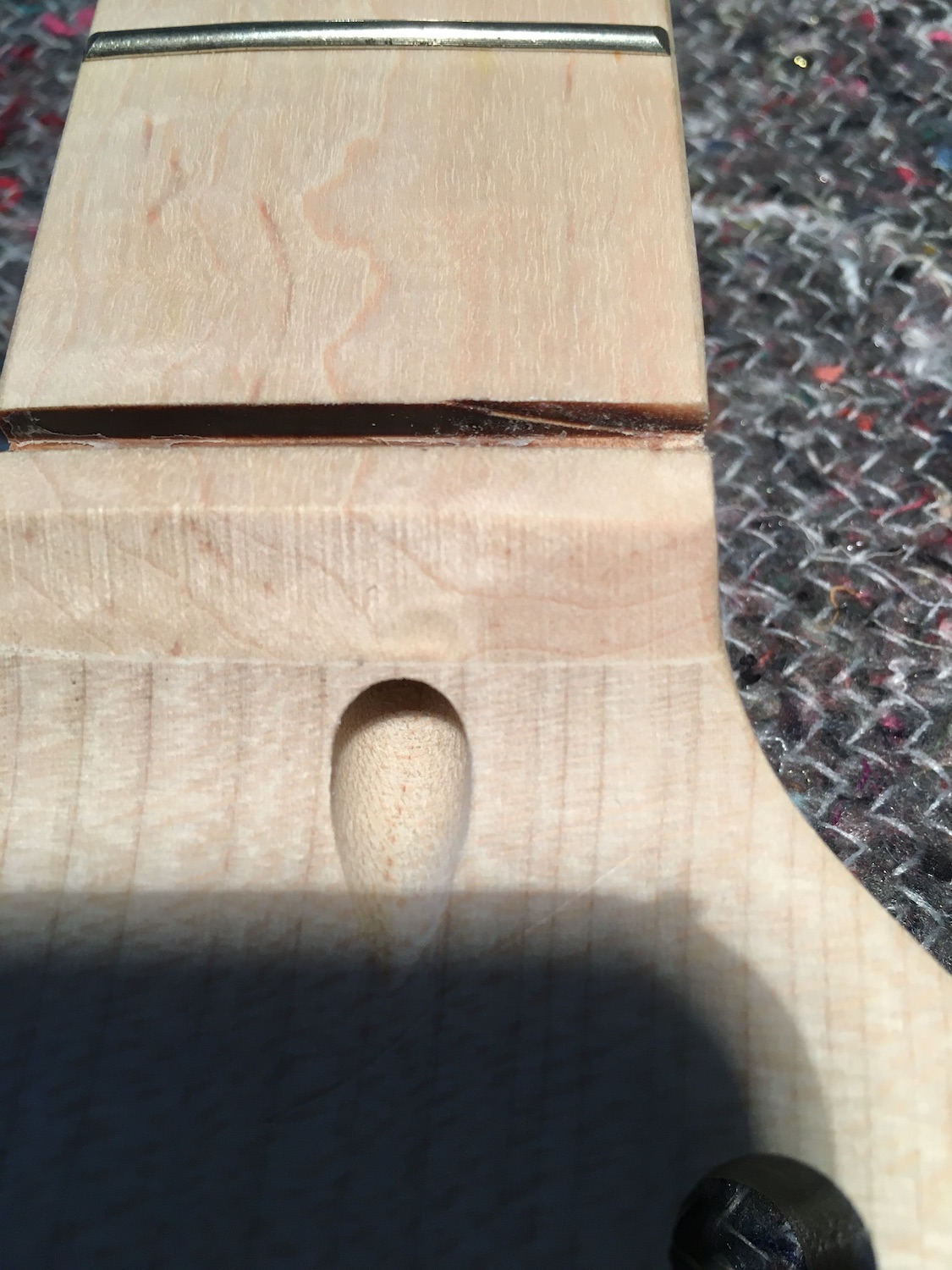4. It looks like the router took two passes at the nut slot, and didn't get them aligned. I wouldn't have worried if the extra gap was at the back, but at the front it may allow the nut to twist. Maybe another sliver of maple...