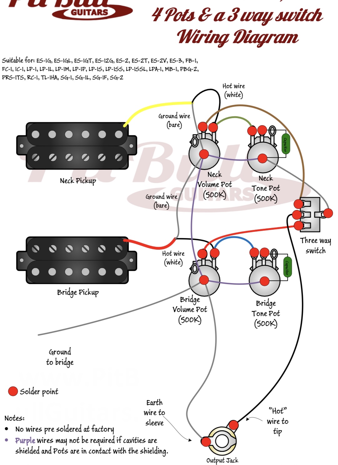 ID:	43256 Hello! I am beginning to work on the wiring for my ES-3 while I let the poly cure. I am making a wiring diagram that is more accurate for the ES-3 in terms of the placement of the parts, but I’m a bit confused about some of the connections on the PitBull diagram. Am I correct in saying that the switch is grounded to the neck tone pot, the jack and bridge wire are both grounded to the bridge volume pot, and both pickups are grounded to the neck volume pot? Also, does the diagram want you to ground the jack and bridge wire to the bridge volume using separate wires? Can I ground wires to different pots in order to avoid overcrowding, or does it matter which pots the wires are grounded to? Anything helps!!