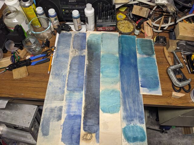 The Saman stain - for the darker colours - has a lot more solids than the turqoi- turqou- turquoise. For the surrounding blue, I thinned it with water to let the grain show through. Yesterday's first application was kind of muddy (despite the photo) so I used a spray bottle to move some of the blue towards the edges where I'm going for the abyssal look.
