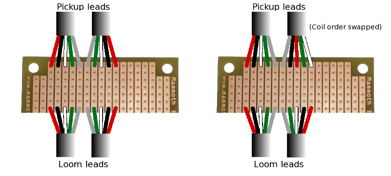 The A pots are used on the Master controls, as I'd expect them to be used most, and the B pots are used as the individual pickup volume controls. Swap the A's and B's around if you think you'll be using the pickup volumes more than the master. The two 0.047uF caps are wired in series on the tone control, which gives you a nett 0.0235uF value. If you want the darker 047 tone just use a single cap. The tone is wired on the output of the master volume, as per the original schematics, but this can make them a little intertwined (volume affects tone, tone affects volume) so be warned.