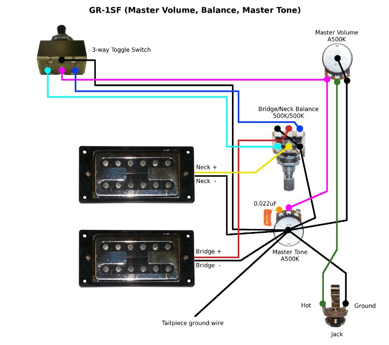 This diagram is using stock parts only and has a Master Volume, Master Tone, and individual volumes for each pickup:
