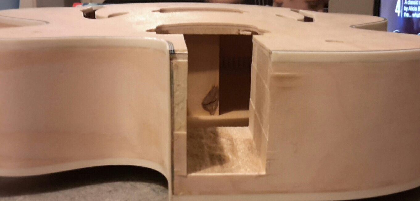 Alternatively to a clamp, wrap tape around from the top bout , over the repair and into the neck pocket.