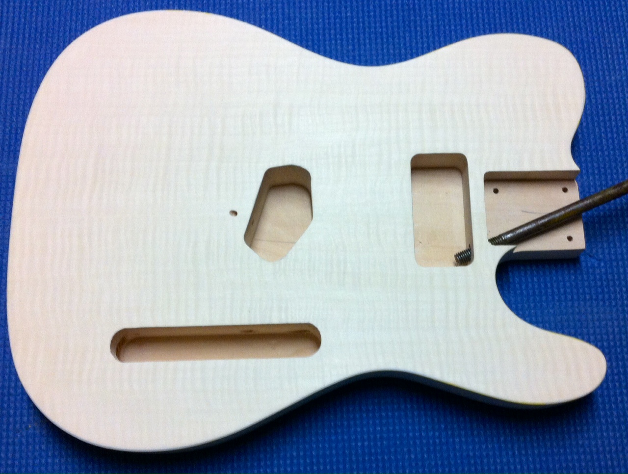 Maple cap is very thin and will be lucky to get a very light 320 grit dusting. Would love to grain fill or use a dark dye to pop the grain but too chicken to risk going through the cap so will play around with varying depths of colour on the top to create light and shade. For this one as it has white binding went with white pickguard and chrome hardware, Rosewood fret board. Thought long and hard about colours and as everyone has been doing blue lately will have a crack a doing Turquoise. Bought Epson 664 Ink Jet Refill Ink in Cyan (Blue) as it already starts out quite aqua blueish. Yet to do a few test runs on a bit of scrap timber to work out water to ink ratio to get desired colour. Here are some shots of the body.
