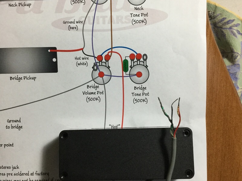 Hi, greetings from U.S. First build, 5 string bass. Per the 2 humbucker, 4 pot wiring diagram, Looks like the only wire from each pickup that's used is the white and ground. Doesn't seem right. The white & red are twisted together and the green and bare are as well. Black is by itself. Do I separate these And just use the white wire as the only wire or use the red and white together and the grounds from the pickups, rest are all jumpers. Just cut off the black wire?