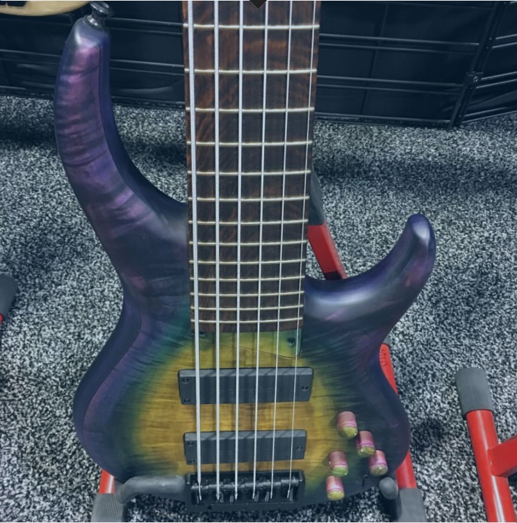 Thats definitley got a flamed maple cap, which the IB6S doesn't have but i assume you knew that. The bust is unusual, but not impossible. If you were in Australia, I would point you in the direction of U-beaut dyes, which are water based. I've seen a couple of greeny blue bursts done with those dyes. The purple can just be mixed by using the colours. The finish is just a satin finish so either a satin based acrylic or poly spray, or if you use shellac or tru oil, just don't sand to full shine.