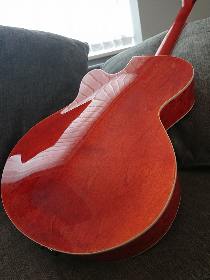 hi there as some of you would have seen i had problems with my gr1sf project, basically my original stained look was jeopardized by sanding through the veneer by mistake! racked my brains on how to save it and this is what i came up with, sides neck and back in crimson guitars orange stain and front of body and peghead metal flake atomic orange happy is an understatement, all metal flake, staining, pinstriping and so on all done by me, other than the p90 pickups and the truss rod cover and gretsch knobs its out the box stock. the nut will need replacing as its miles to high and i'm yet to wire in the pickups and input jack but thought id share some photos looking forward to your opinions thanks