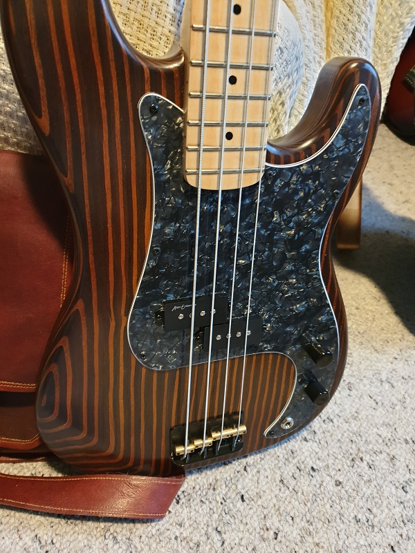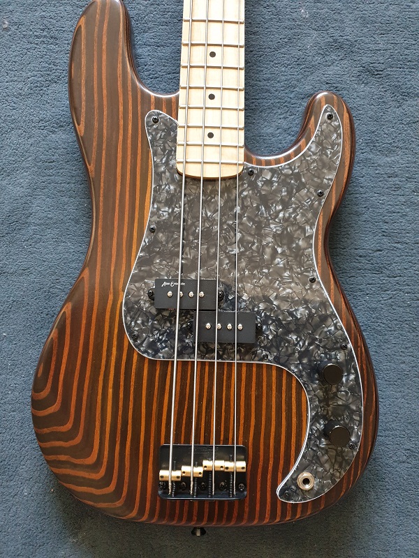 This is a PBG Zebrawood Body precision base with a maple neck and maple fingerboard. A Black pearloid pickguard holds a set of Entwistle Pickups (Ceramic Bar). The volume and tone circuit is a repeat of my norm....split the P-Bass pickup and use a push pull volume pot. The Tone Pot is a Bourns mini pot. Orange Drop Capacitor gives tone and sound is moved out via a switchcraft jack socket. A Black Tusq nut and a complete black out hardware kit round out the fittings....the bridge has been swapped out for a Wilkinson Black Bridge I imported from the U.K.