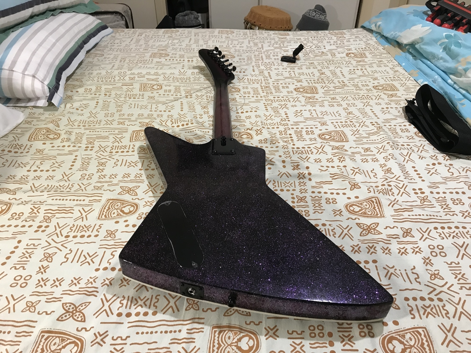 On the back and sides, I used black spray paint, then sprinkled purple and silver metal flake on it, then finished it off with SCA Acrylic Clear and McGuire’s Ultimate Compound/Polish. The metal flake sparkles beautifully under both sunlight and artificial light... don’t think the photos do it justice. Regarding the bolt-on neck, went with a two tone purple/black finish finished in tru-oil which I can understand why people really like the feel of. Has a bone nut and body outlined in triple white binding.
