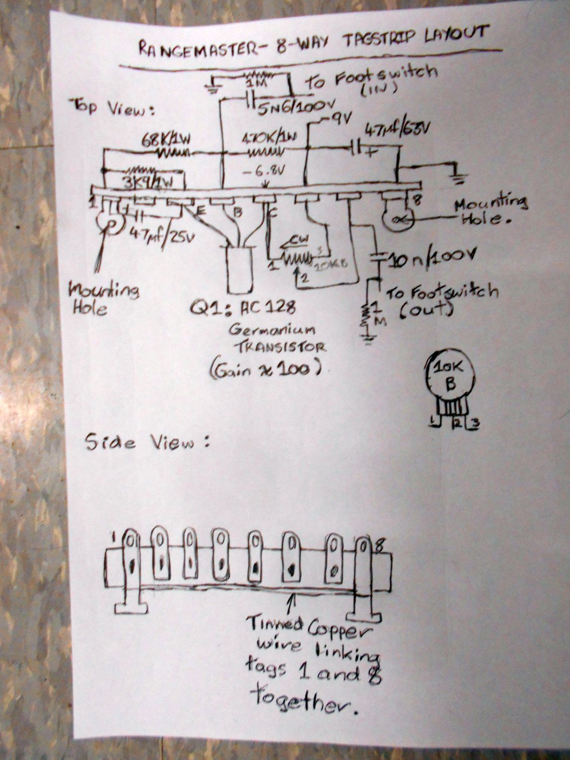Sorry it took so long, but, as promised, here's a hand-drawn layout diagram of the 8-way Tagstrip in my Rangemaster pedal, feel free to use it for your own Rangemaster pedal build: