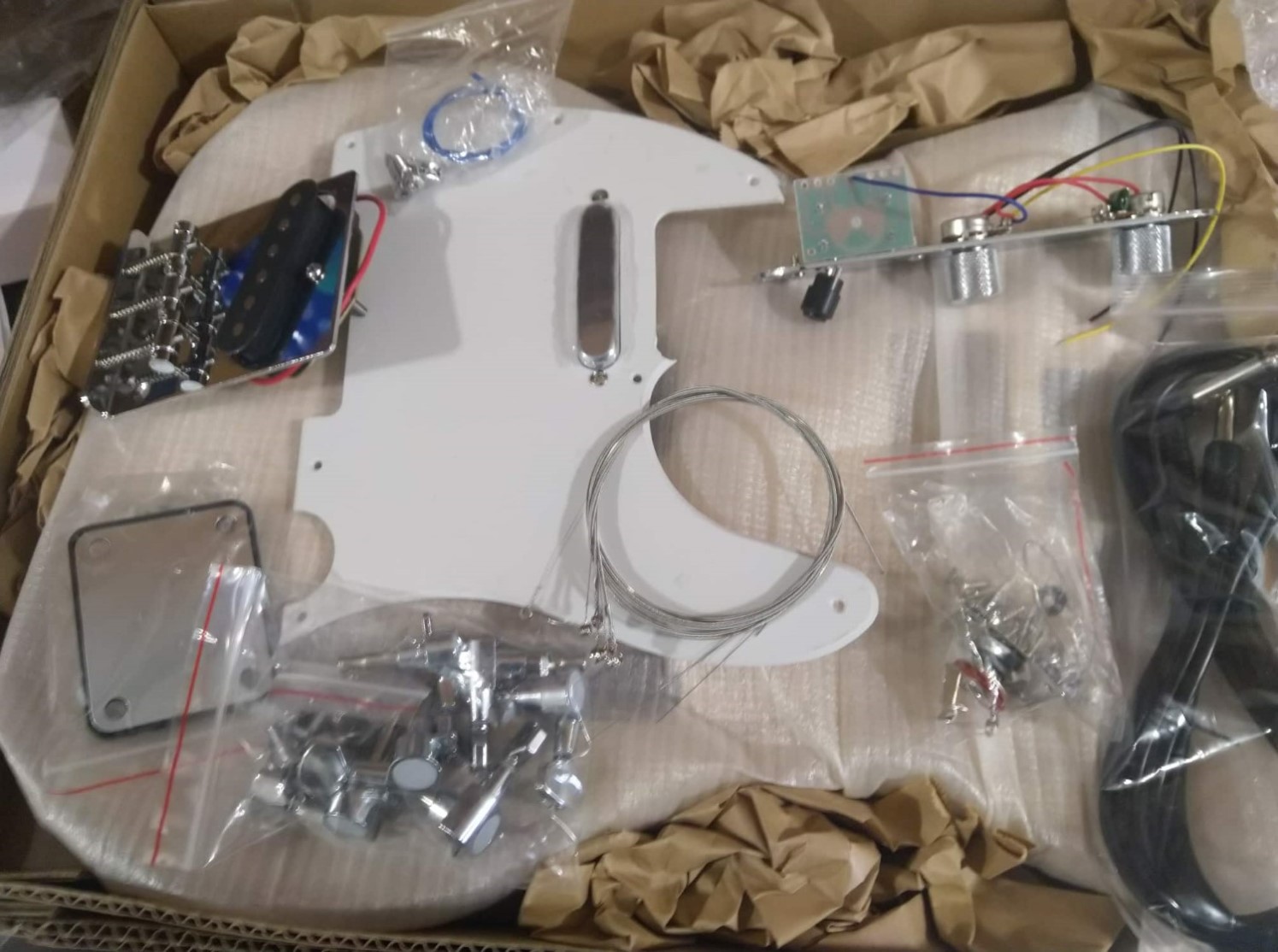 When arrived, I've checked the kit and comes nicely packed. There're no missing parts, the bodie and neck seems fine (neck with 21 frets is for another project).