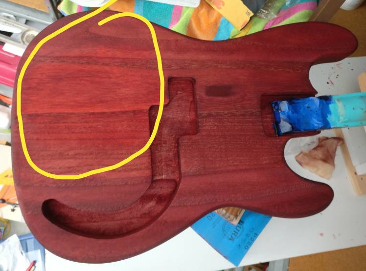 The body has nice figuring, so I am going to try to stain it. So I probably won't bath it in CA. I have enough clear coat from my last bass to using it on this bass. If it doesn't harden it enough, it'll have dents like my basswood bass does. Got some Aqua Coat to pore fill, and have started to do some experiments on some scraps of Paulownia. We'll see ;-)
