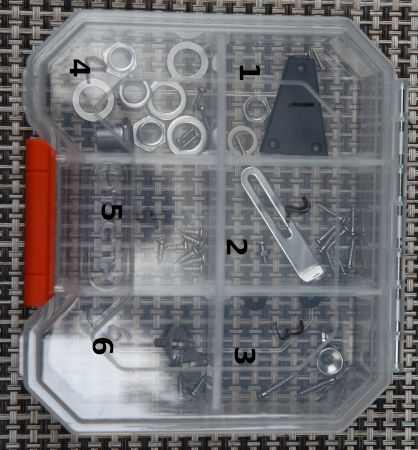 So, first thing that struck me was that the bag with all the screws wasn't marked, so no indication what screws were for what hardware. I think I figured it out...here's a picture of them in the same groupings , only in a box: