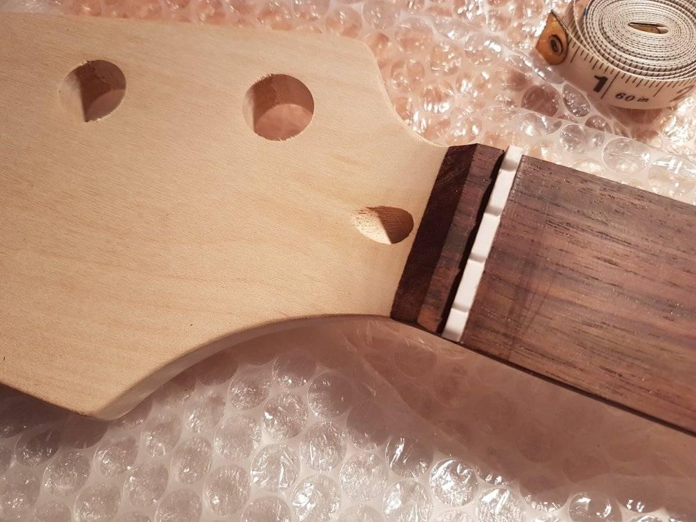 1. One of the pre-drilled holes for the neck mounting screws was off-centre on my JB-4L kit. (See above link) Other people building the same model reported the same thing. Apparently you can get get the screws all in if you insert them all at once and sequentially tighten them all a little bit at a time, but the recommended procedure is to fill the hole and drill a new one, using the backing plate as a guide. A round bamboo skewer made a good dowel to fill the errant hole.